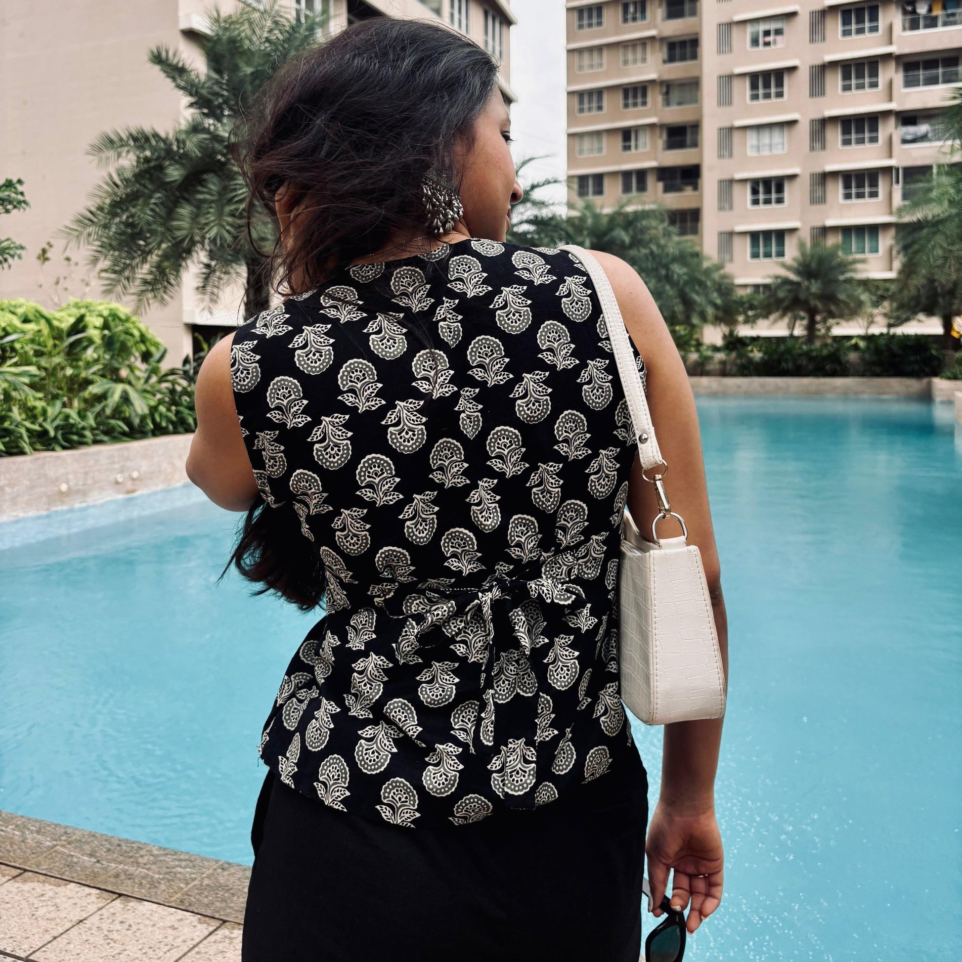 Made from premium cotton in a deep black base, this sleeveless vest features intricate kalamkari-inspired floral motifs in soft ivory and muted green tones — a tribute to heritage prints.