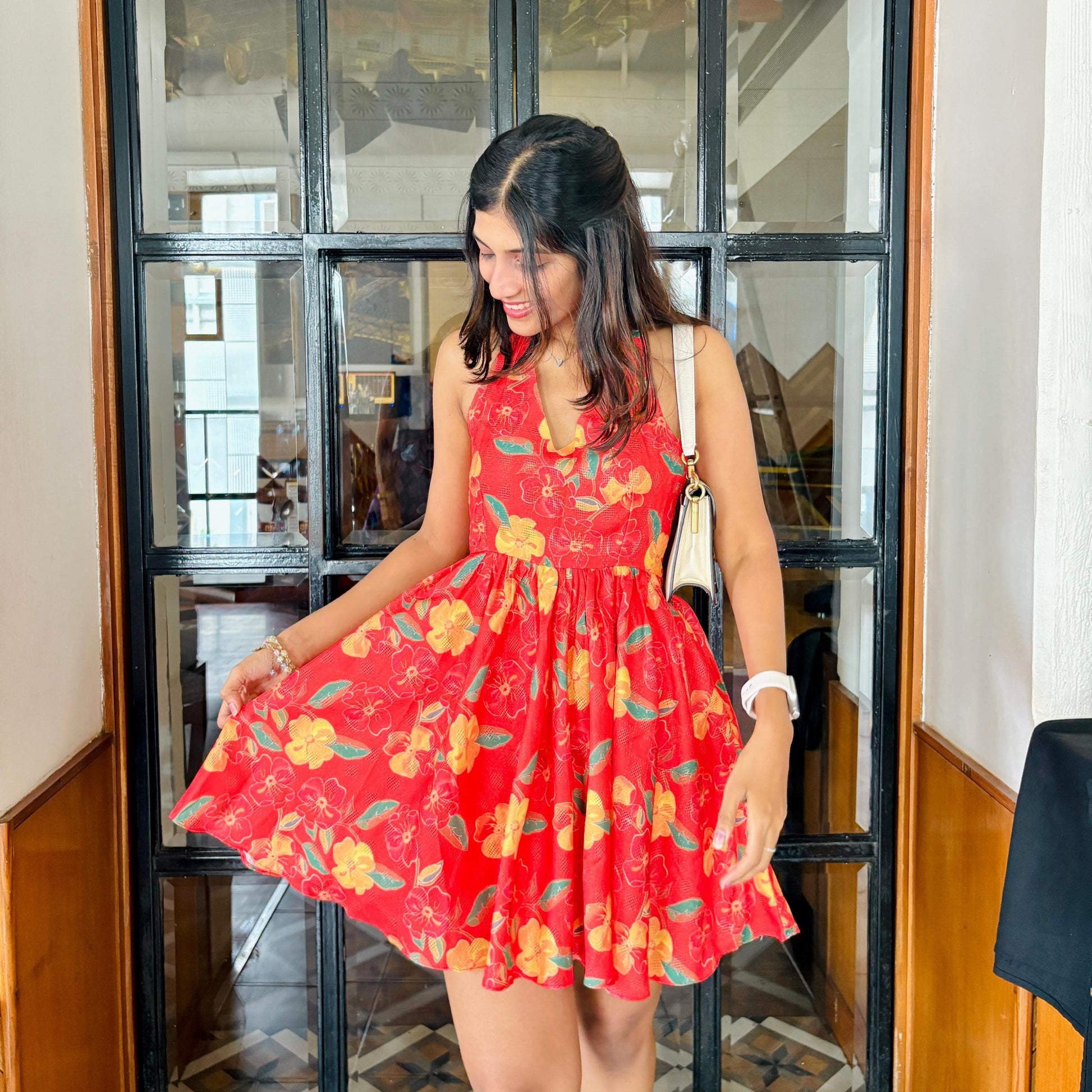 A Vibrant Red base meets oversized yellow and crimson florals in this halterneck short dress. Made in breathable jacquard cotton with subtle woven texture, it’s made to twirl through summer days and rooftop nights alike.