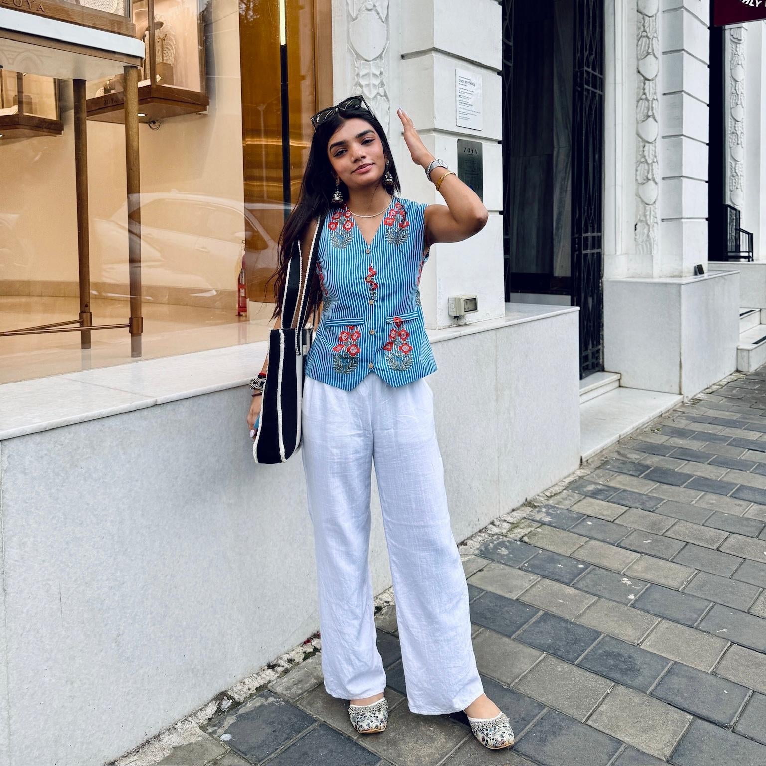 Crafted in a bold blue-and-white vertical stripe cotton base, this sleeveless vest features delicate red floral threadwork on the chest and waist — a nod to timeless Indian artistry.
